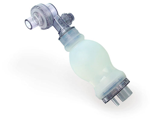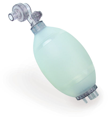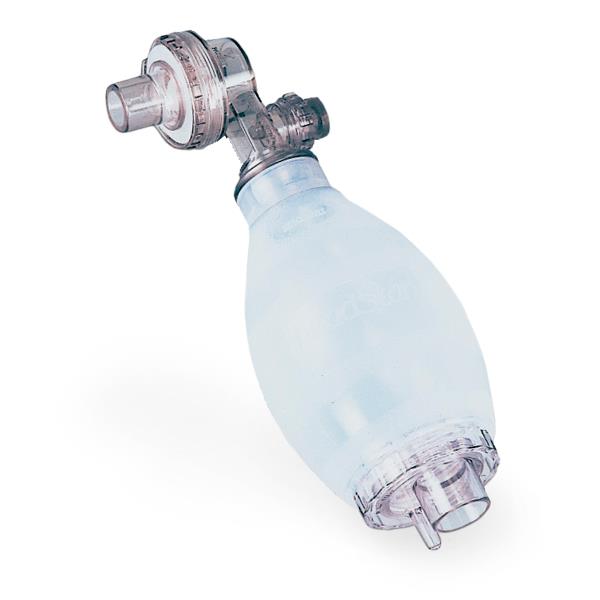 Pallone rianimatore in silicone trasparente autoclavabile completo di valvola di sovrapressione con taratura a 40 mbar per bambini, dotato di connessione alla bombola, raccordo per innesto reservoir e connessioni alle maschere.