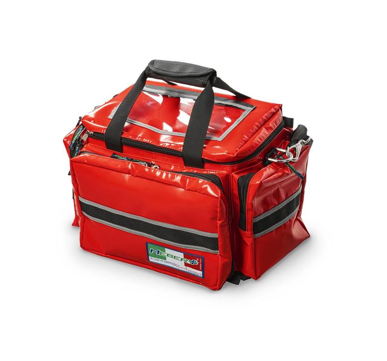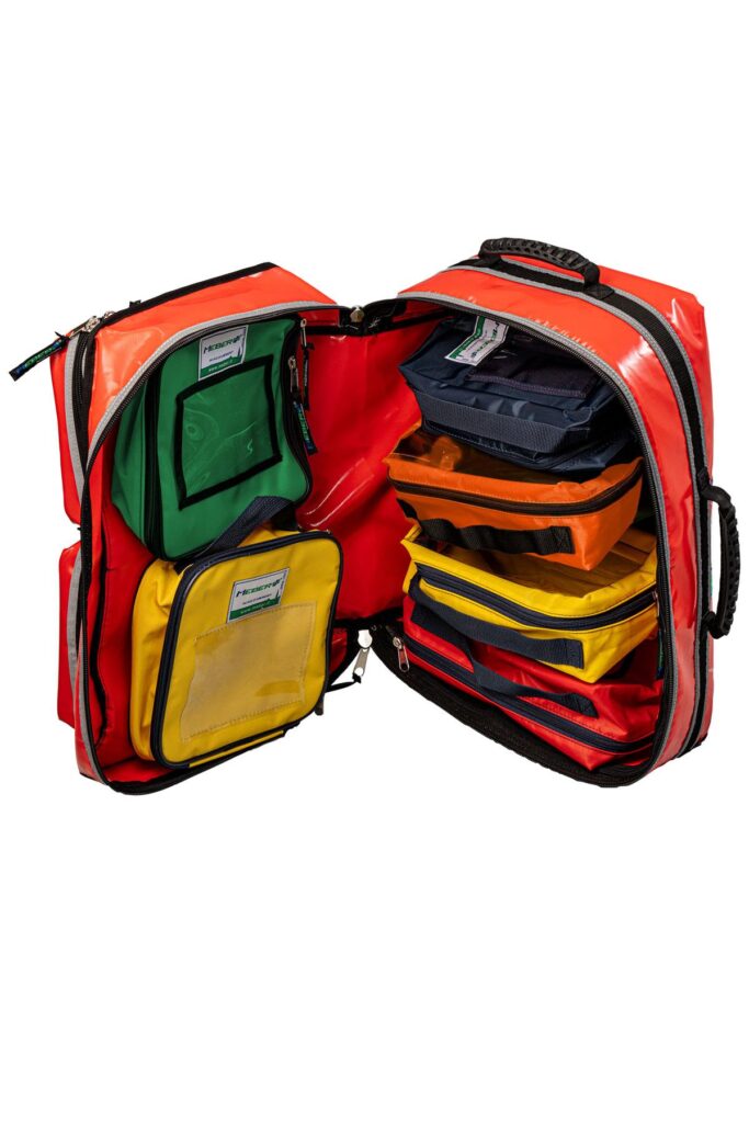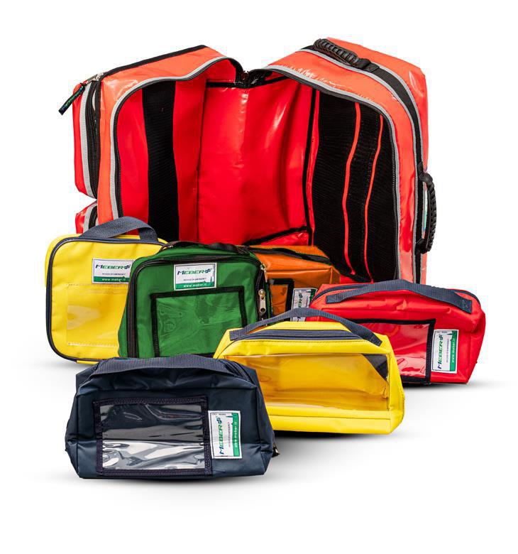 Il vano centrale è dotato di attacchi in Velcro® per il fissaggio di 4 custodie colorate di serie, ciascuna con ampia finestra trasparente rinforzata da doppia cucitura, e di 2 borse professionali (diagnostica e medicazione), sempre di serie, nelle quali alloggiare e organizzare gli strumenti necessari all’intervento. Completano lo zaino una tasca frontale con fasce interne porta oggetti, due maniglie (una superiore e una laterale) rivestite in gomma antiscivolo per il trasporto a mano e due spallacci rinforzati con bande rifrangenti.