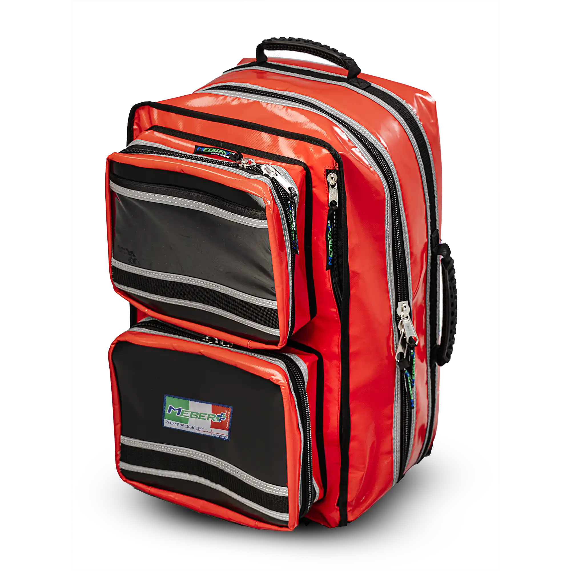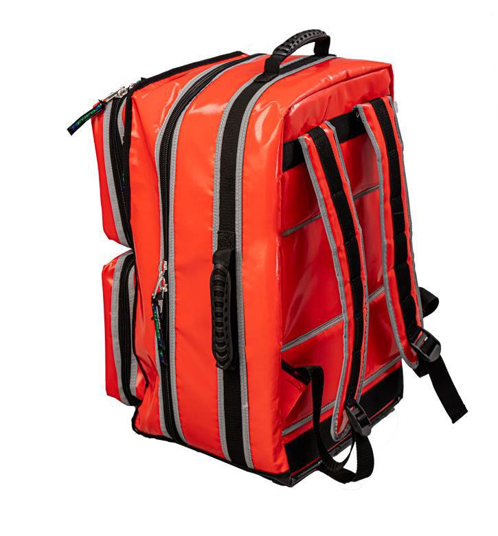Zaino modulare pratico, compatto e semplice, adatto a volontari e professionisti del soccorso. Completamente realizzato in PVC a celle chiuse di colore rosso. Antistrappo, lavabile e resistente, con tasca frontale trasparente per personalizzazioni, con doppie cuciture, robuste cerniere da 10 mm, bande rifrangenti ad alta visibilità su tutti i lati esterni, fondo in PVC e con supporti di appoggio in plastica. Internamente presenta una struttura protettiva rigida a guscio composta da materiale termoplastico e con  un ampio vano centrale con apertura frontale a doppia zip e 2 tasche frontali esterne.