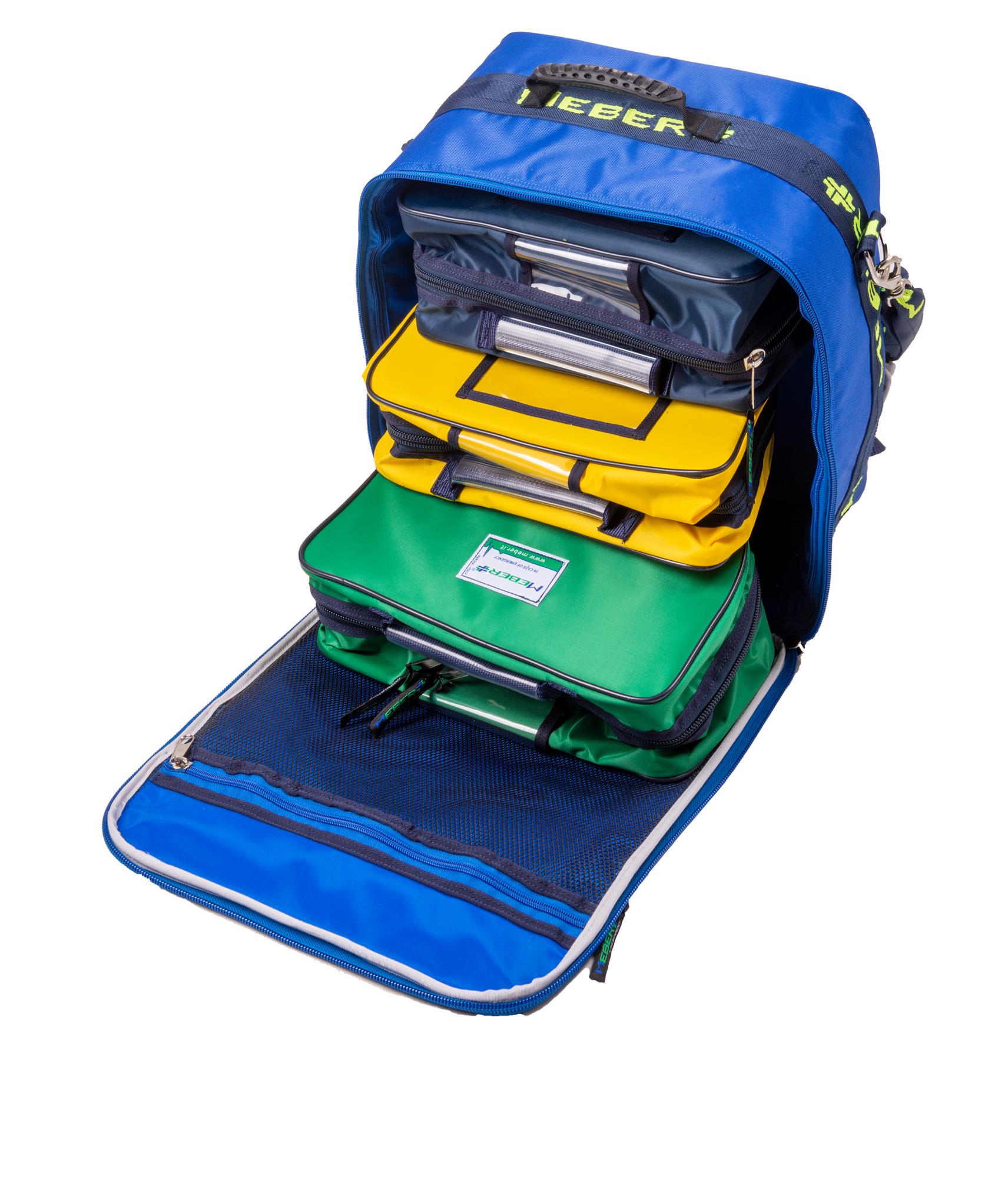 Zaino medicale compatto e robusto realizzato in nylon antistrappo color blu royal con doppie cuciture, ampia banda rifrangente ad alta visibilità, fondo in PVC, spallacci rinforzati e tracolla sganciabile per il trasporto a spalla. Si compone di un ampio vano rigido dotato di fasce in Velcro® che consentono il fissaggio di tre sacche professionali (blu, giallo e verde) di serie. Dimensioni: 36 x 44 x 23 cm (L x H x P). Peso: 3,6 kg