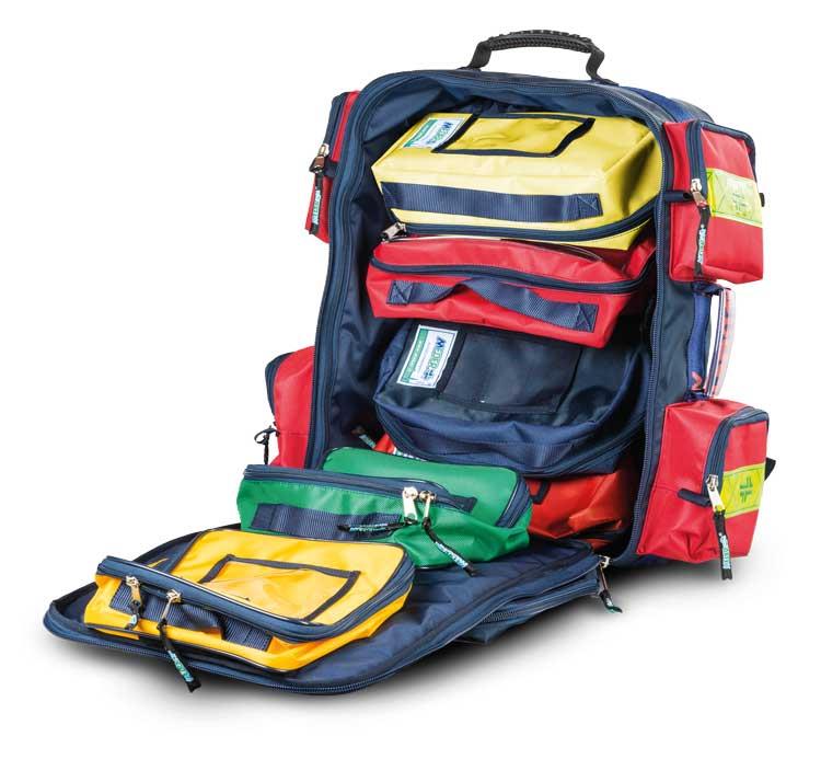 Zaino modulare pratico, compatto e semplice, adatto a volontari e professionisti del soccorso. Esternamente è realizzato in nylon antistrappo blu con doppie cuciture, robuste cerniere da 10 mm, bande rifrangenti ad alta visibilità su tutti i lati, fondo in PVC a celle chiuse e supporti di appoggio in plastica. Internamente presenta una struttura protettiva rigida a guscio composta da materiale termoplastico e si compone di un ampio vano centrale con apertura frontale a doppia zip e 4 tasche laterali esterne. Il vano centrale è dotato di attacchi in Velcro® per il fissaggio di 4 custodie colorate di serie, ciascuna con ampia finestra trasparente rinforzata da doppia cucitura, e di 2 borse professionali (diagnostica e medicazione), sempre di serie, nelle quali alloggiare e organizzare gli strumenti necessari all’intervento. Completano lo zaino una tasca frontale con fasce interne porta oggetti, tre maniglie (una superiore e due laterali) rivestite in gomma antiscivolo per il trasporto a mano e due spallacci rinforzati con bande rifrangenti.