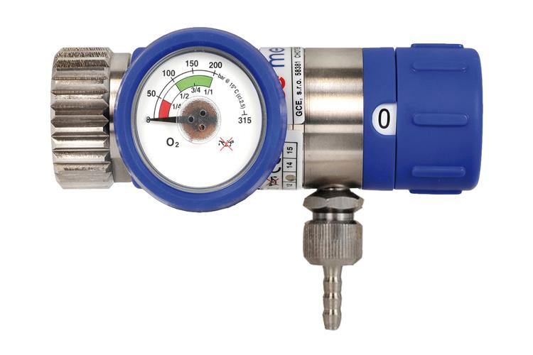 Riduttore di pressione a membrana con manometro e dosatore per regolare l’erogazione dell’ossigeno.