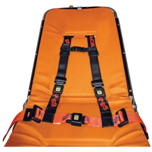 Cintura toracica regolabile arancio/nera con aggancio a 4 punti e nastro MeBer per barelle autocaricanti e sedie.