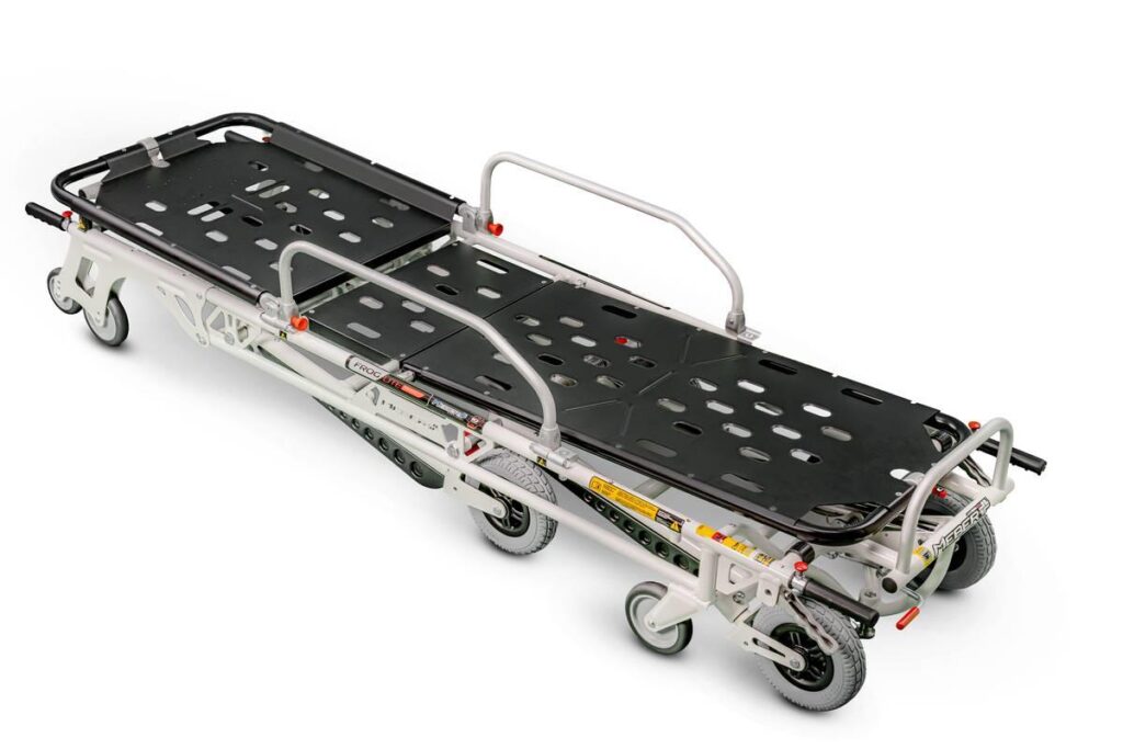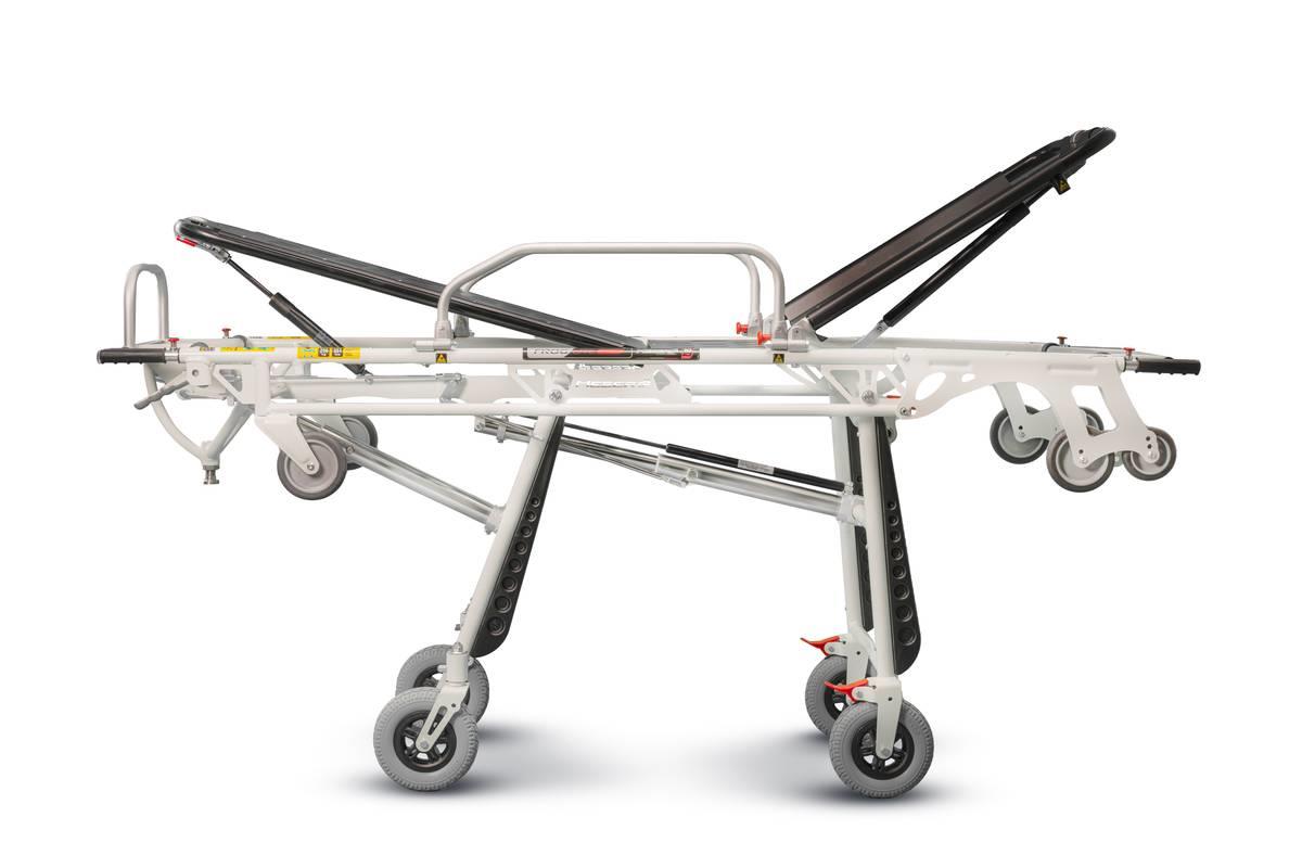 Realizzata completamente in lega di alluminio verniciato, leggerissima, è dotata anche di trendelenburg. 4 ruote in poliuretano (2 fisse con freno e 2 girevoli autocentranti Ø 200 mm) offrono un elevato confort su pavimentazioni sconnesse e superfici irregolari. Il materiale con cui è costruita la rende facilmente sanificabile.