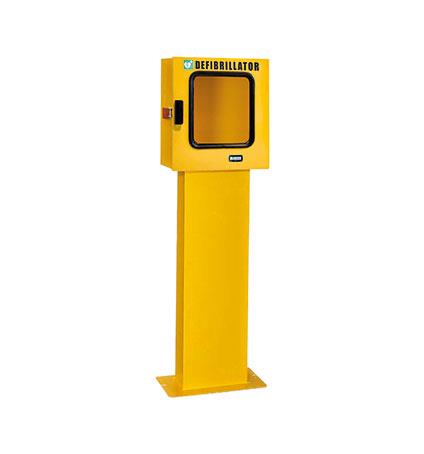 Piantana per teca porta defibrillatore (art 8396 ed art. 8398) di colore giallo, in acciaio al carbonio P02 spessore 7/10 verniciato a polvere in epossipoliestere con fori di fissaggio a pavimento.