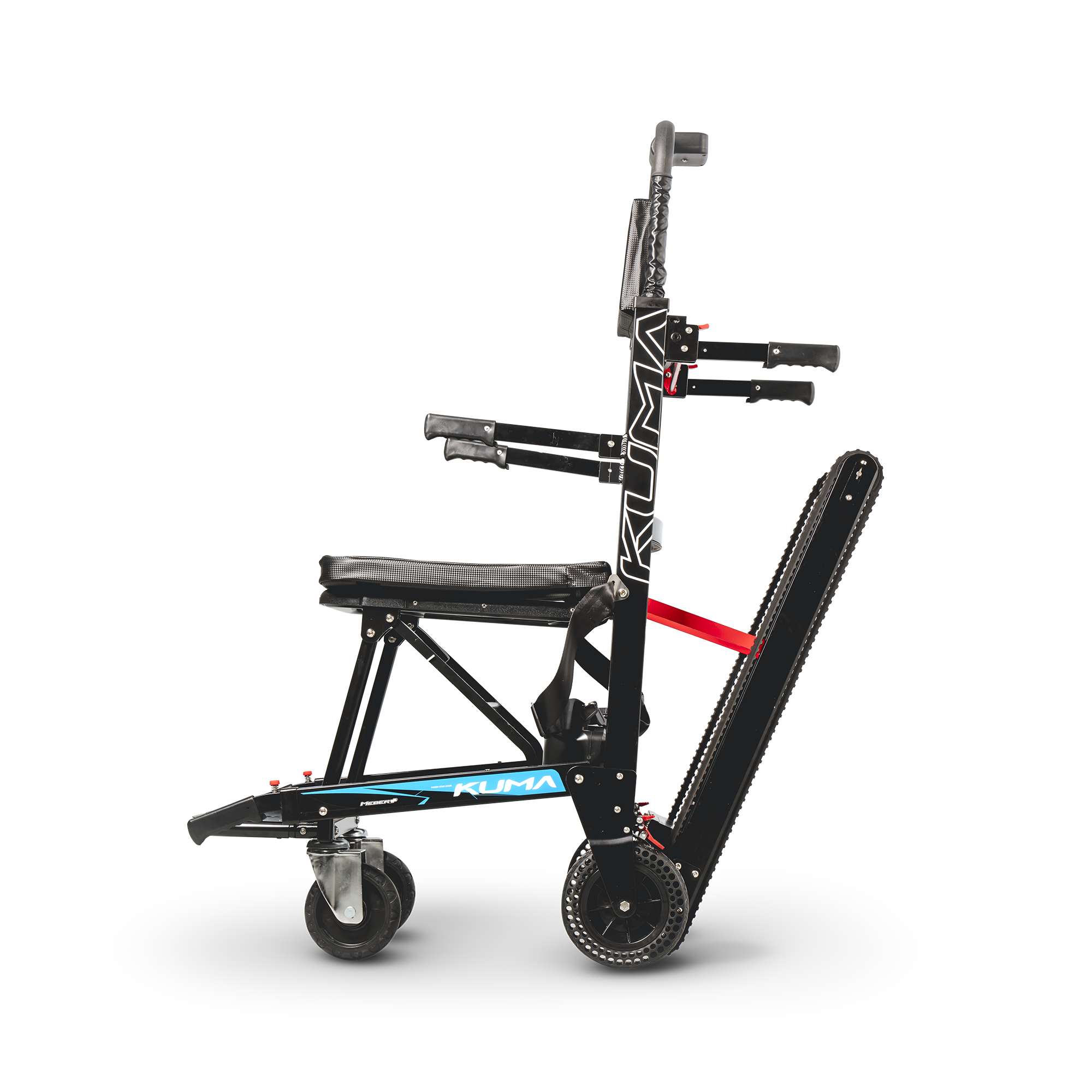 Kuma è la sedia motorizzata Me.Ber. caratterizzata da telaio in lega di alluminio, batteria alimentata agli ioni di litio, leve anteriori, pratici braccioli, pedana poggiapiedi, pratico maniglione allungabile (con annessa una piccola consolle di comando dei cingoli) e 4 ruote (2 fisse Ø200 mm con freno e 2 girevoli Ø125 mm). Il motore elettrico aziona i cingoli consentendo la salita e la discesa delle scale senza sforzi per l’operatore. Kuma garantisce una portata di 181 kg e offre una comoda seduta grazie al cuscino e al poggiatesta di serie. Pratica e maneggevole, la sedia motorizzata Kuma è molto semplice da utilizzare. Colore: nero.