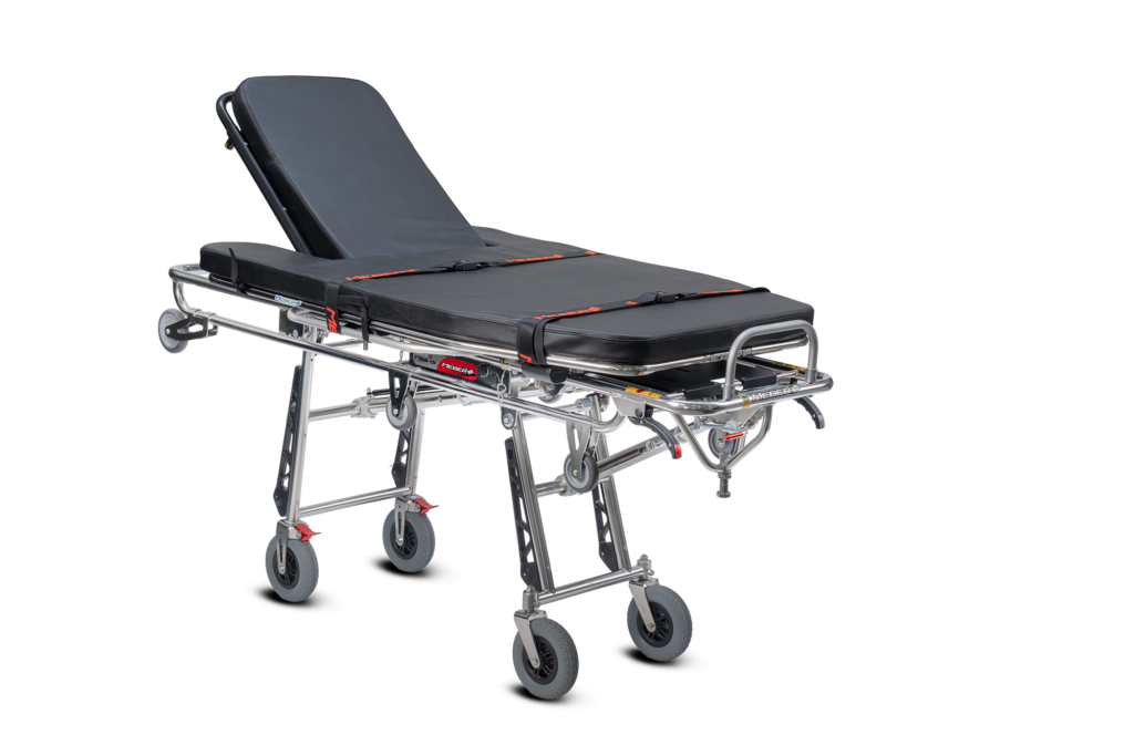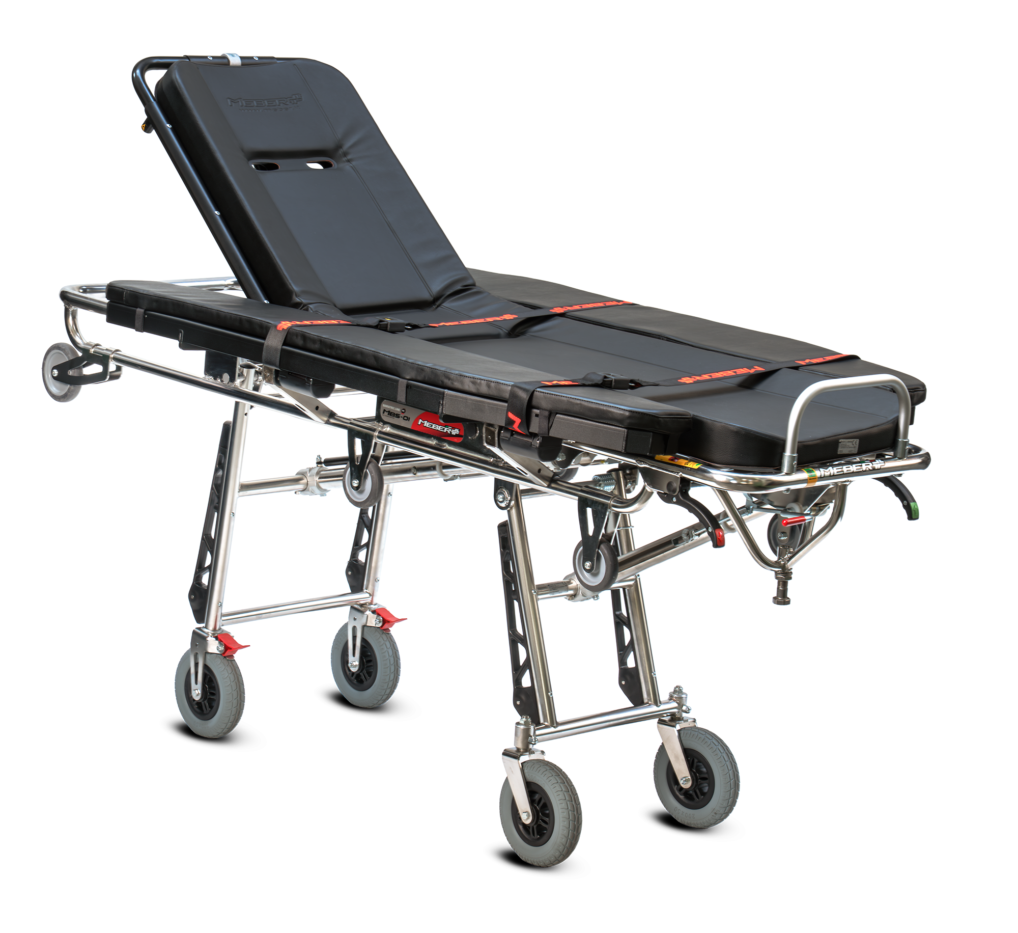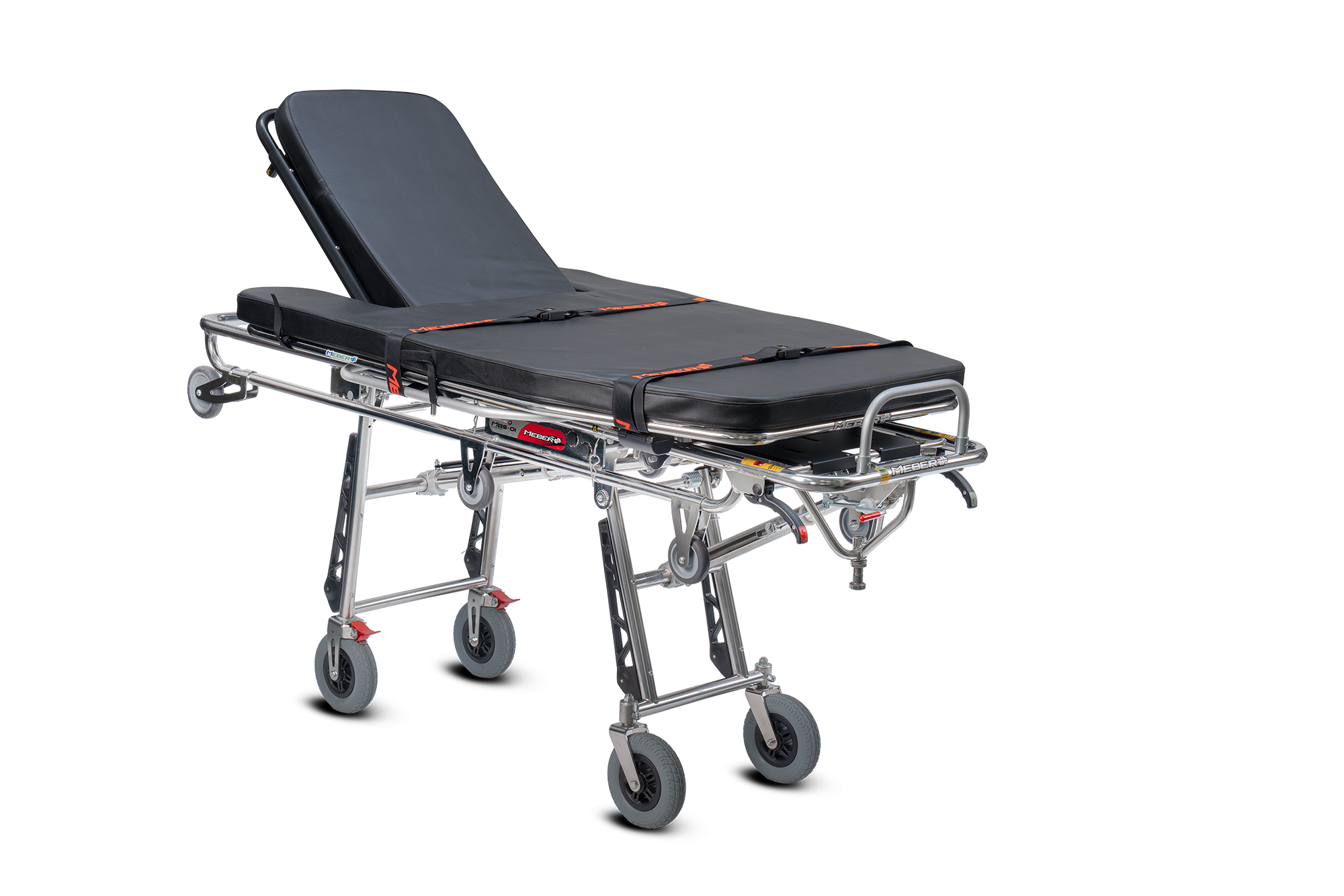 Barella autocaricante appositamente studiata per il trasporto di pazienti bariatrici è costruita in una speciale lega di acciaio inox ad alta resistenza. Il telaio è stato rinforzato per garantire una portata di 350 kg, maggiorata rispetto alle altre barelle autocaricanti della gamma MeBer, ed è stato dotato di 2 ruote anteriori Ø125×25 mm e 2 ruote posteriori Ø100×25 mm per la massima sicurezza nelle fasi di carico e scarico dal mezzo di soccorso. Le 4 ruote maggiorate Ø200, 2 fisse con freno e 2 girevoli autocentranti, conferiscono un alto grado di comfort al paziente. Il pianale rigido costruito in alluminio rende questo dispositivo facilmente lavabile e sanificabile. È inoltre dotata di schienale reclinabile da 0° a 80° azionato da una molla a gas bloccabile in qualsiasi posizione e di spondine laterali ribaltabili. Le gambe verticali sono protette da paracolpi in plastica. Viene fornita completa di materasso (art. 7013) e cinture (n. 2 art. 608-A/MEB o 608-N/MEB e n. 1 cintura art. 612/AN-2/MEB o 612/N-2/MEB).