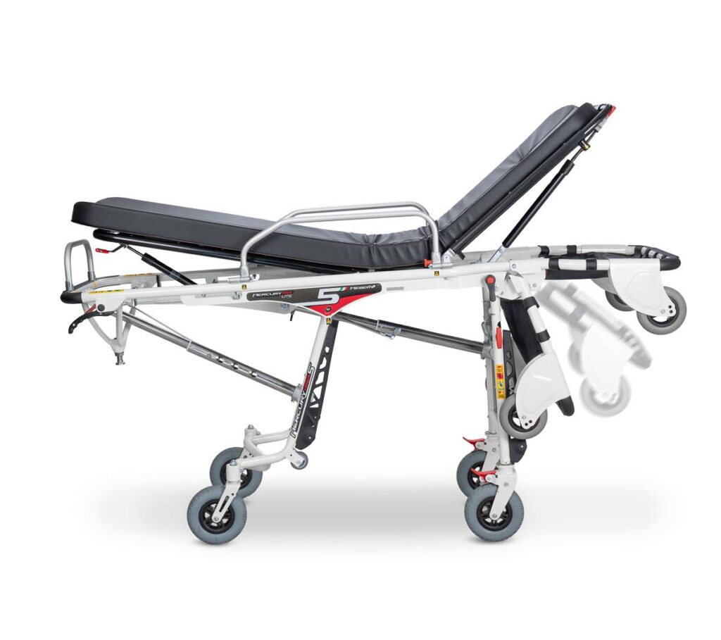 Mercury Lite Cinque, barella autocaricante in alluminio a 5 posizioni con 4 ruote girevoli versione alta – certificata EN 1865 e completa di materasso e cinture