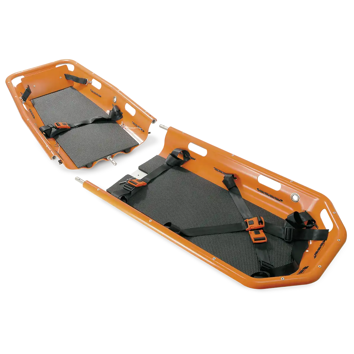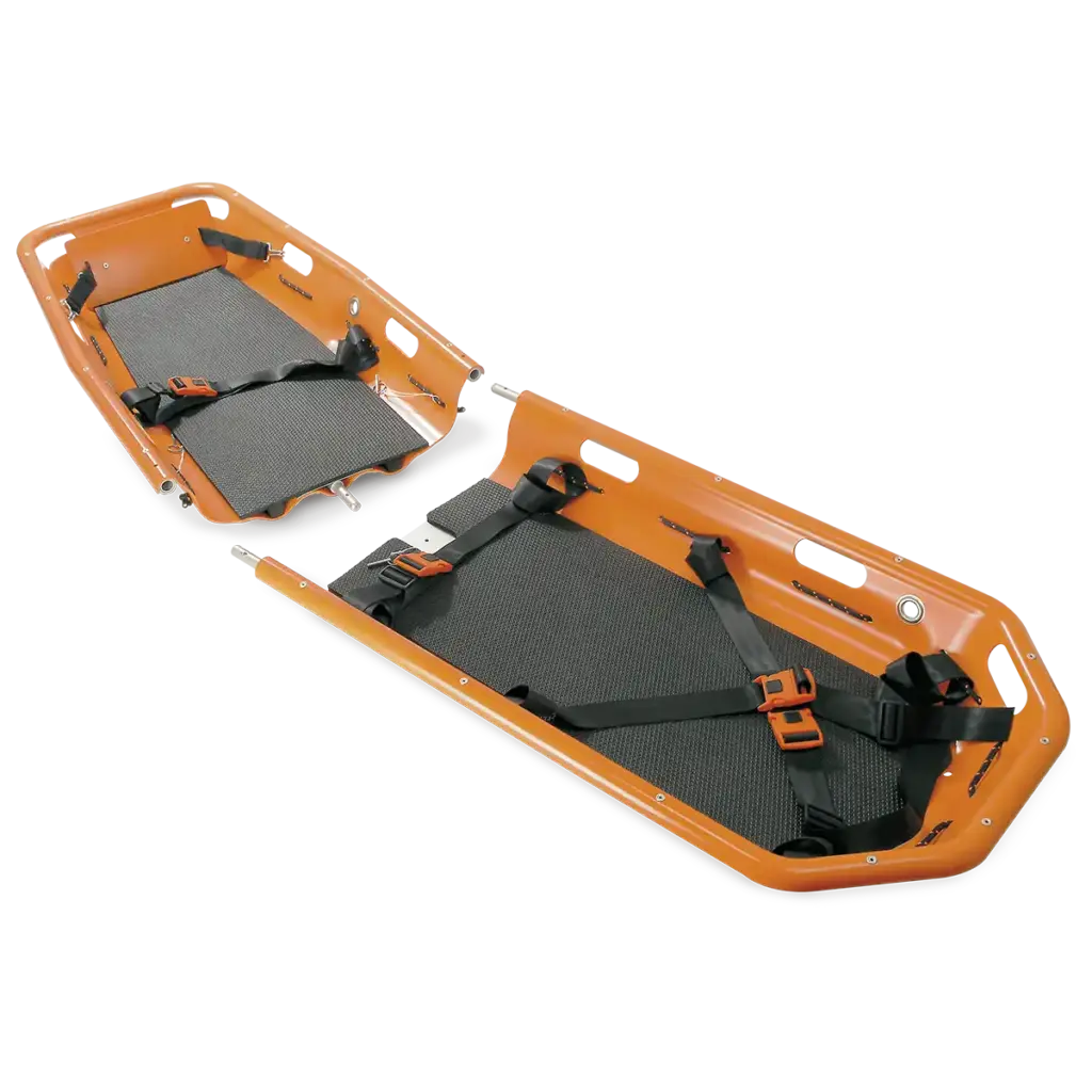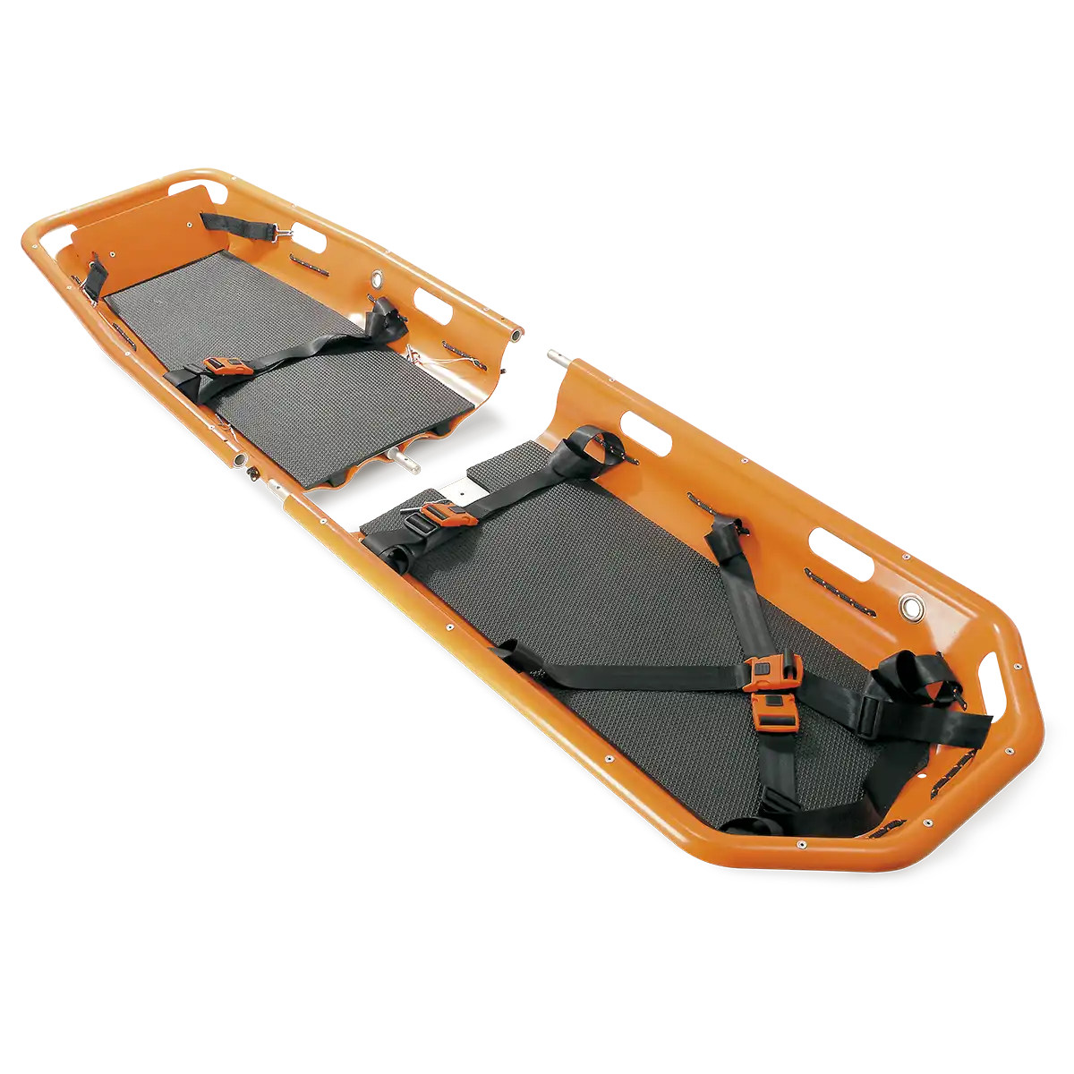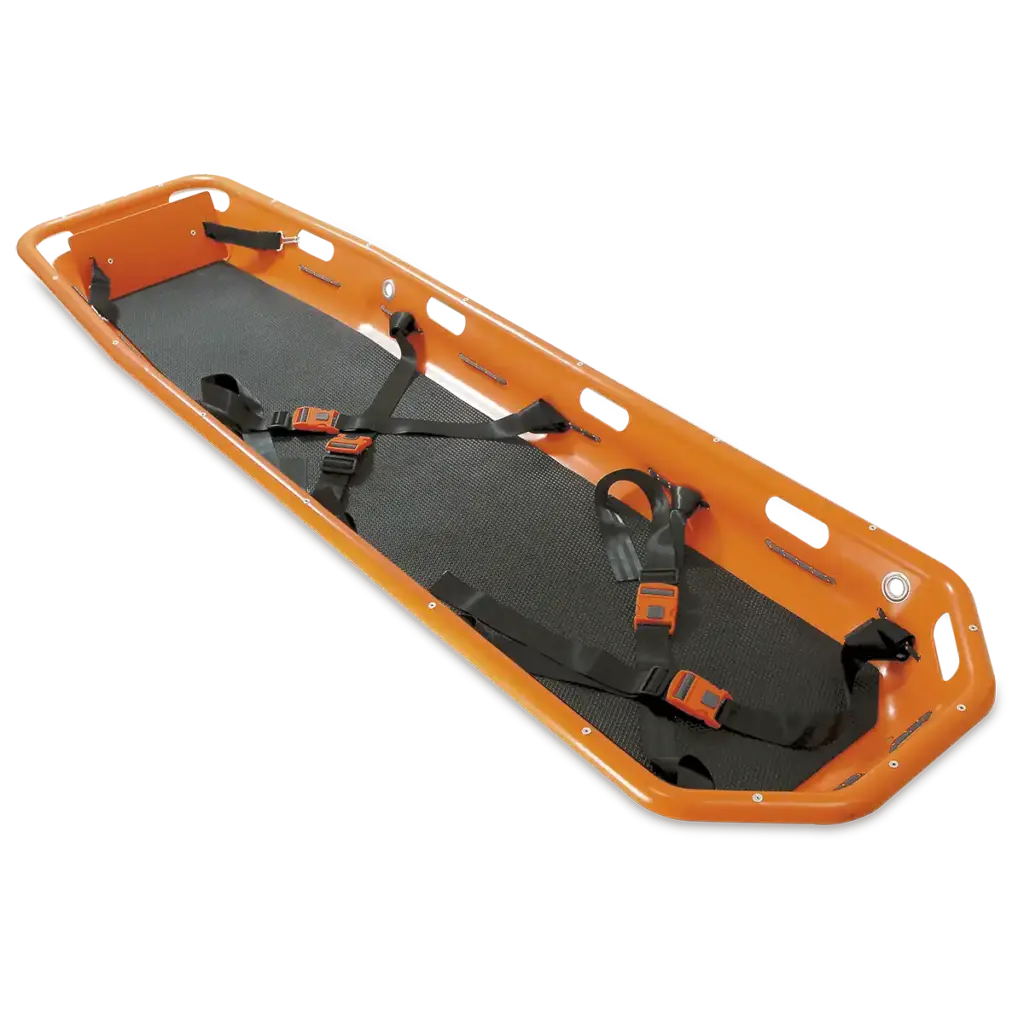 Composta da un guscio esterno di ABS polimerico modificato, supportato da una robusta struttura in alluminio. 12 maniglie la rendono estremamente maneggevole. Materiale resistente a prodotti chimici, UV, ruggine e corrosione. Robusti passanti di ottone posizionati nei bordi della barella ne permettono il sollevamento con l’accessorio Art. 16100-005. Uno strato di schiuma EVA è presente all’interno della barella per un maggior comfort del paziente. Supporto ferma piedi regolabile e quattro cinture di fissaggio completano la fornitura standard.